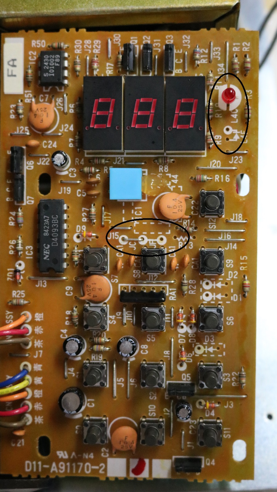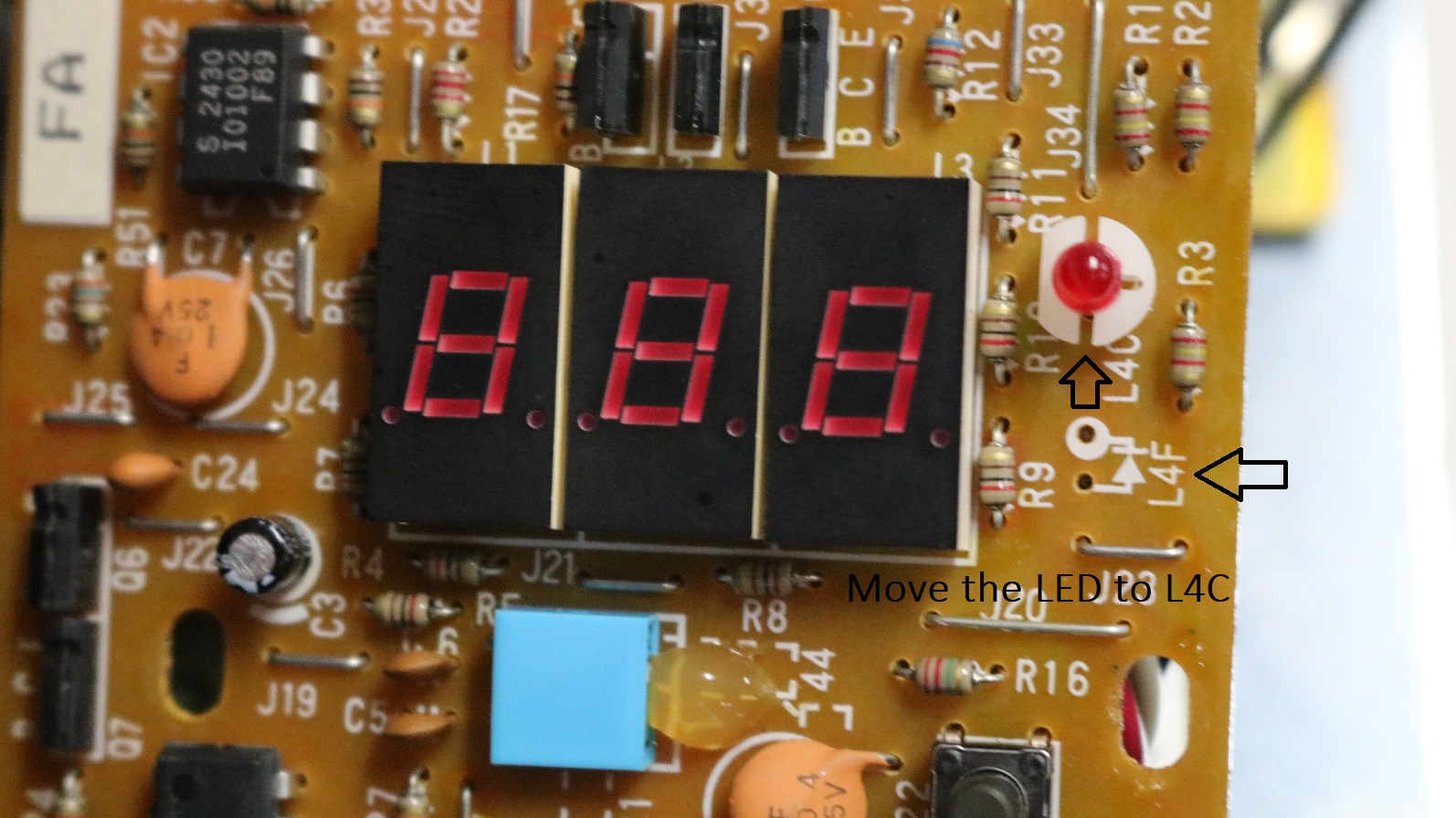 - Locate the red LED ( L4F )on the upper right hand of the PCB. Desolder and remove the LED from ( L4F) and move the ED up to (L4C) immediately above the current position