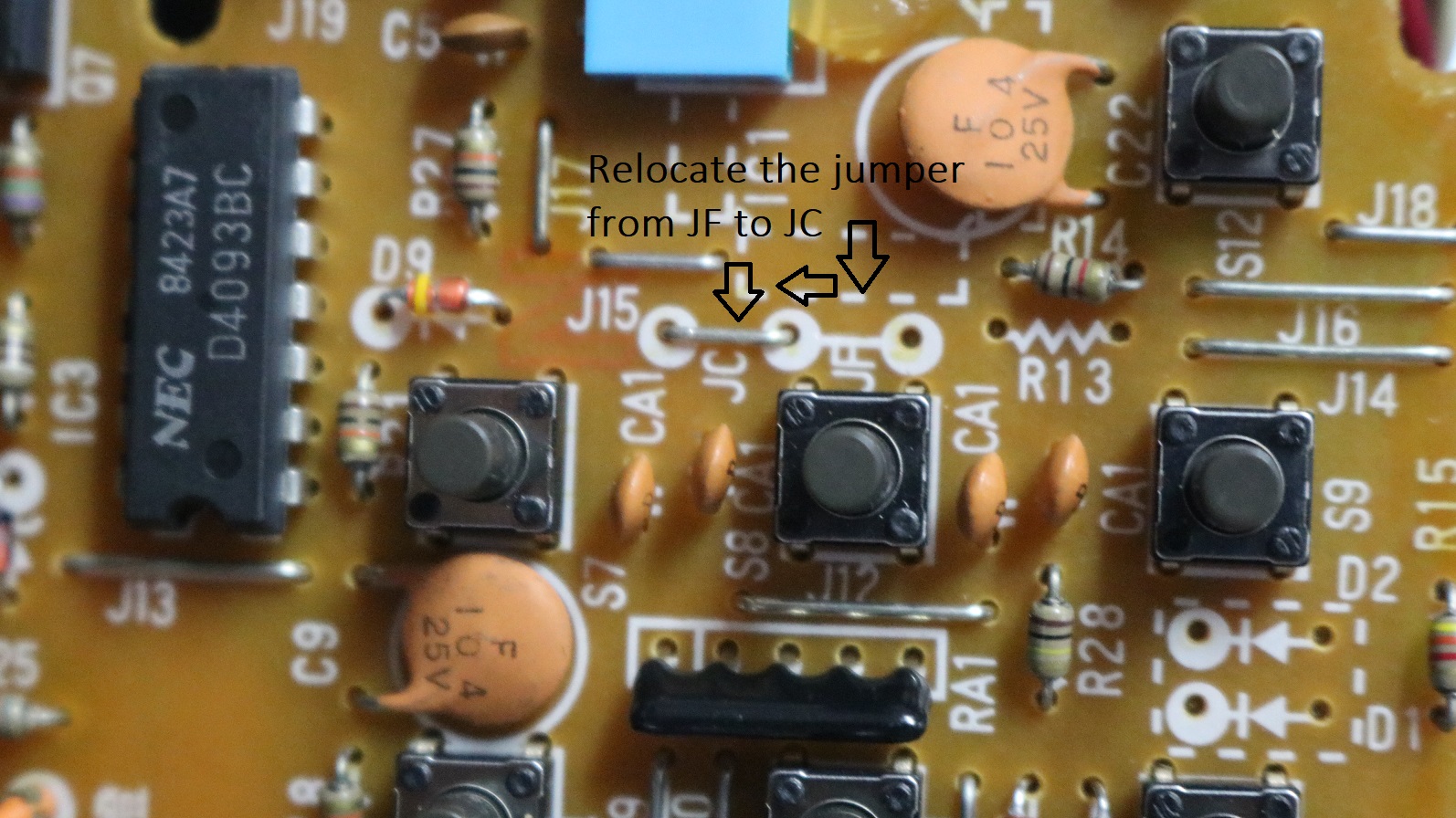 - Desolder the jumper from ( JF ) and move it over 1 spot to the left to its new location labeled ( JC) .